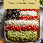 This American Flag Layered Taco Dip is a vibrant, festive appetizer perfect for celebrations and parties. Layers of seasoned refried beans, creamy guacamole, and sour cream are topped with shredded mozzarella, diced tomatoes, and sliced black olives arranged to resemble the American flag. Ready in just 30 minutes, this no-cook, visually appealing dip is sure to be a crowd-pleaser.
