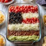 This American Flag Layered Taco Dip is a vibrant, festive appetizer perfect for celebrations and parties. Layers of seasoned refried beans, creamy guacamole, and sour cream are topped with shredded mozzarella, diced tomatoes, and sliced black olives arranged to resemble the American flag. Ready in just 30 minutes, this no-cook, visually appealing dip is sure to be a crowd-pleaser.
