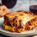 This Beefy Cottage Cheese Baked Ziti is a comforting Italian-American classic featuring al dente ziti pasta baked in a rich, savory meat ragoût of ground beef and pork simmered with aromatic herbs and tomato passata. A luscious mixture of cottage cheese, parmesan, and mozzarella is folded through the saucy pasta before being topped with extra mozzarella and baked until golden and bubbly, creating a hearty and satisfying meal perfect for family dinners or gatherings.
