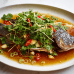 This Cantonese-Style Steamed Fish recipe highlights a delicate and aromatic approach to cooking fresh white-fleshed fish. Featuring a fragrant mix of ginger, scallions, cilantro, and a flavorful soy-sherry sauce, the fish is steamed to perfection and finished with sizzling hot oil poured over fresh herbs and optional chili slices for an authentic Cantonese dining experience.