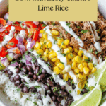 This vibrant and flavorful Carnitas Bowl features tender, juicy carnitas served over zesty cilantro-lime jasmine rice, with sautéed onions and red peppers, black beans, fresh pico de gallo, shredded cheese, crisp romaine lettuce, and a dollop of sour cream. It’s a quick and satisfying meal perfect for lunch or dinner, blending Mexican-inspired ingredients into a wholesome, colorful bowl.