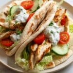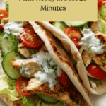 Discover the delightful flavors of Chicken Pitas, a quick and healthy meal perfect for any day. Grilled chicken fillets are sliced and stuffed into whole wheat pitas with fresh lettuce, ripe tomato, crisp cucumber, thinly sliced onion, and creamy tzatziki sauce. This easy-to-make recipe takes just 25 minutes and offers a nutritious, savory wrap that’s sure to become a favorite in your meal rotation.