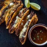 - Serve: Serve the tacos hot with a side of birria consommé for dipping and optionally garnish with chopped cilantro, diced onion, and lime wedges.