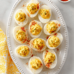 Classic deviled eggs featuring creamy, tangy yolk filling seasoned with mustard, dill pickle relish, and a touch of hot sauce, garnished with paprika. Perfect as a delicious appetizer or party snack that’s easy to prepare and always a crowd-pleaser.