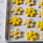 - Arrange Flower Petals: Group five same-colored dough balls in a circle on each baking sheet, leaving a small center opening to form petals. Continue this to make 12 flowers of each color, spacing the cookies about 2 inches apart. Reserve extra dough balls for flower centers.