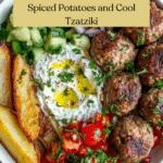 This Greek Meatball Bowl recipe combines juicy baked meatballs with crispy roasted potatoes, fresh vegetables, and a creamy homemade tzatziki sauce, creating a wholesome, flavorful, and protein-packed meal inspired by traditional Greek flavors.