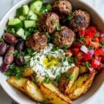 Keywords: Greek meatballs, roasted potatoes, tzatziki sauce, Mediterranean bowl, healthy dinner, baked meatballs, Greek cuisine