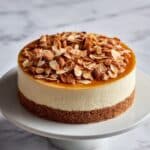 Store the assembled cake covered in the refrigerator for up to 3 days. To keep the almond topping crisp, avoid sealing it too tightly with plastic wrap. Reheat slices briefly at room temperature before serving if desired, but the cake is best enjoyed chilled.