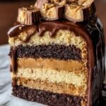 10. Step 10: Chill the cake for 30 minutes to allow the ganache to set. Slice and serve, optionally garnished with extra peanut butter cup pieces.