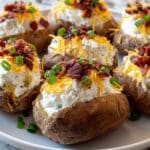 Loaded Baked Ranch Potatoes are a comforting and flavorful side dish perfect for any meal. Crispy on the outside and tender on the inside, these potatoes are topped with creamy ranch, melted cheddar, crispy bacon, and fresh green onions for a satisfying bite every time.