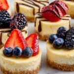 Store leftover mini cheesecakes covered in the refrigerator for up to 3 days. For longer storage, freeze them tightly wrapped—thaw in the refrigerator before serving. Reheat at room temperature or enjoy chilled.