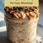 A rich and indulgent take on classic overnight oats featuring creamy peanut butter, luscious caramel, and chocolate pieces for a delicious and convenient breakfast or snack.