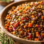 - Combine lentils and vegetables: Transfer the roasted vegetables to a large bowl and mix in the cooked lentils. Adjust seasoning with additional salt, pepper, and lemon juice if desired.