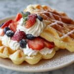 - Serve: Remove waffles carefully, top with fresh sliced strawberries and whipped cream if desired. Serve immediately for best texture and flavor.