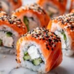 These Tzatziki Avocado Salmon Rolls offer a fresh and elegant appetizer combining creamy avocado, tangy tzatziki, and smoky cold-smoked salmon wrapped into bite-sized rolls. Garnished with cucumber rounds and sesame seeds, they are perfect for entertaining or a light, flavorful snack.